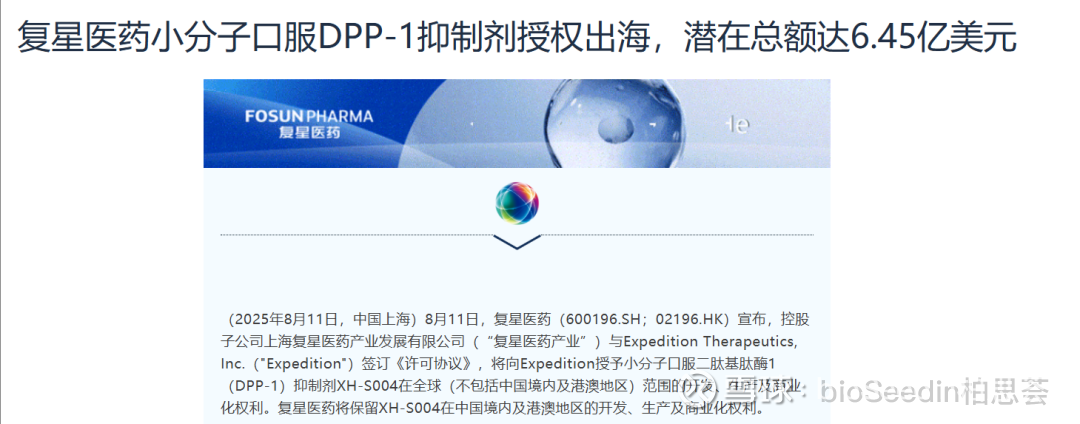8月11日,上海复星医药宣布将在研DPP-1抑制剂XH-S004在中国大陆、香港及澳门地区以外的全球开发和商业化权益转让给新兴炎症性疾病生物技术公司Expedition,作为回报,Expedition为复星支付至多1.2亿美元不可退还的首付款、开发里程碑付款,以及最高5.25亿美元的销售里程碑付款,外加销售提成。