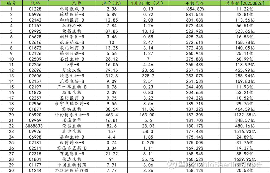 随着创新药企半年报披露逐渐接近尾声,bioSeedin柏思荟也盘点了从2025年初至今创新药药企涨幅TOP榜单。数据肯定不够严整,涨幅也不代表企业实力排名。只希望通过这个线索,窥见数据背后的产业逻辑,探寻那些引领行业变革的标杆企业,观察中国医药创新的未来走向。
