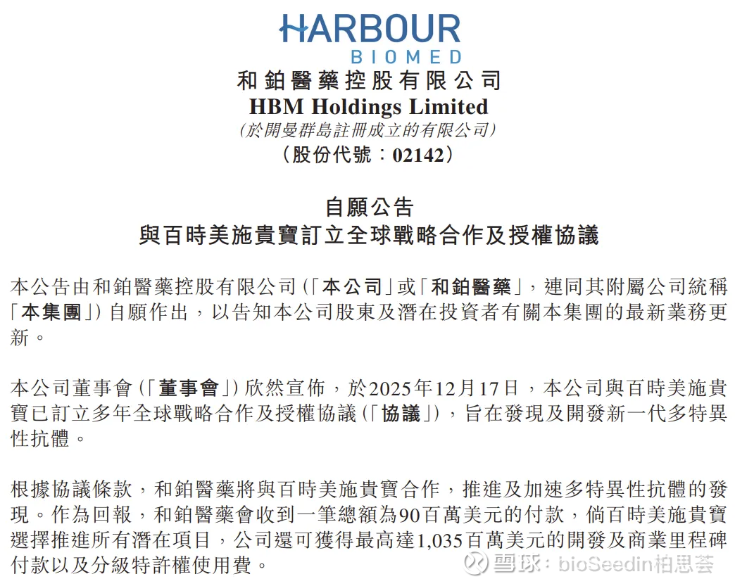 12月17日,和铂医药又达成一笔重磅交易,宣布与百时美施贵宝(BMS)达成长期全球战略合作与许可协议,共同开发新一代多特异性抗体疗法。根据协议,和铂医药将获得9000万美元付款,10.35亿美元开发及商业里程碑,以及一定比例的销售分成。