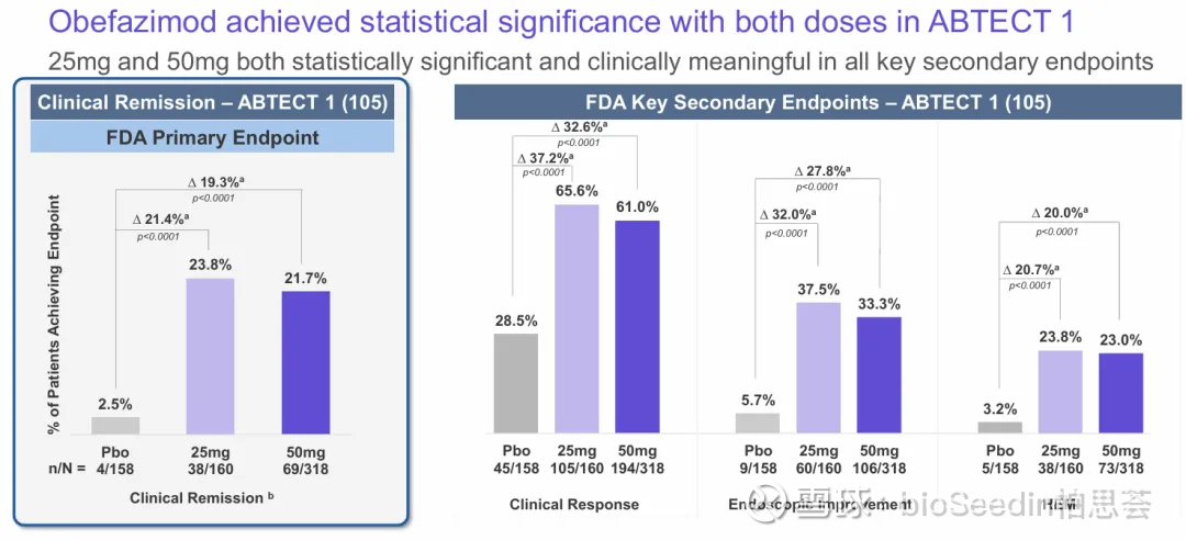 2025年7月,Abivax宣布Obefazimod针对中重度活动性溃疡性结肠炎(UC)患者的两项III期研究(ABTECT-1和ABTECT-2)均达到主要终点。数据显示,在两项研究的50mg剂量组中,经安慰剂调整后的临床缓解率分别达到19.3%和13.4%,且对JAK抑制剂或生物制剂应答不足的难治性患者,仍能发挥显著疗效。