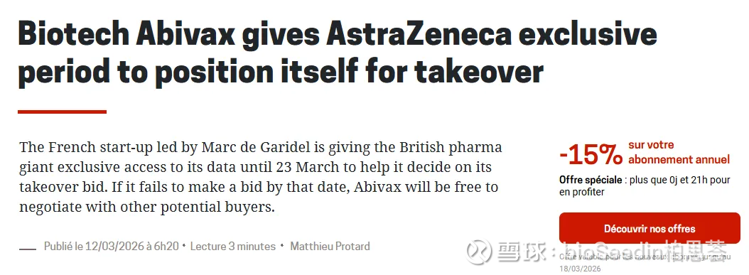 如今Abivax再度身处舆论旋涡,据法国媒体《La Lettre》援引消息人士爆料,阿斯利康自2月初起已获得独家查阅Abivax“数据室”的权限,该独占期将持续至3月23日。市场传闻在此期间,阿斯利康将以每股176欧元、总价约157亿美元的天价收购Abivax。