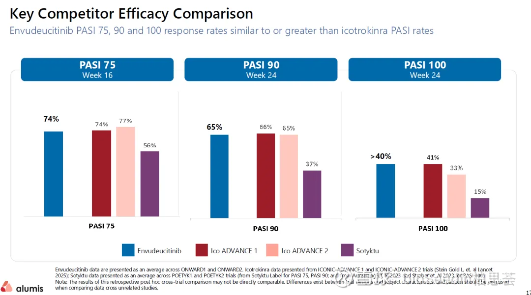 根据Alumis披露的ONWARD系列III期研究结果,Envudeucitinib在第24周实现PASI 90(银屑病面积与严重程度指数改善90%)的比例分别为68.0%和62.1%,PASI 100分别达到41.0%和39.5%。