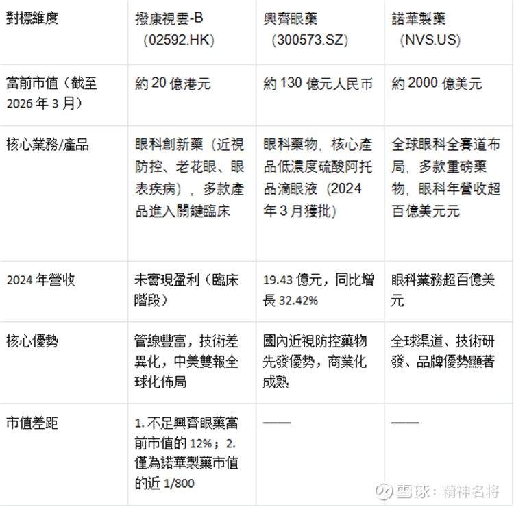 選取國內眼科創新龍頭興齊眼藥、全球眼科巨頭諾華製藥作為核心對標標的,通過多維度數據對比,清晰凸顯撥康視雲的估值優勢與成長潛力,具體對標數據如下: