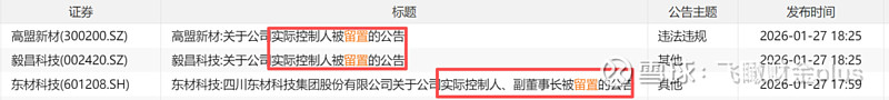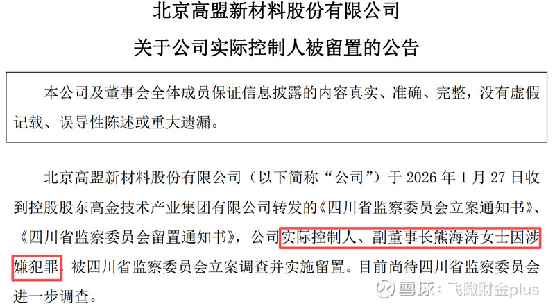 高盟新材公告,于2026年1月27日收到控股股东高金技术产业集团(以下简称高金集团)转发的《四川省监察委员会立案通知书》、《四川省监察委员会留置通知书》,公司实际控制人、副董事长熊海涛因涉嫌犯罪,被四川省监察委员会立案调查并实施留置。目前尚待四川省监察委员会进一步调查。