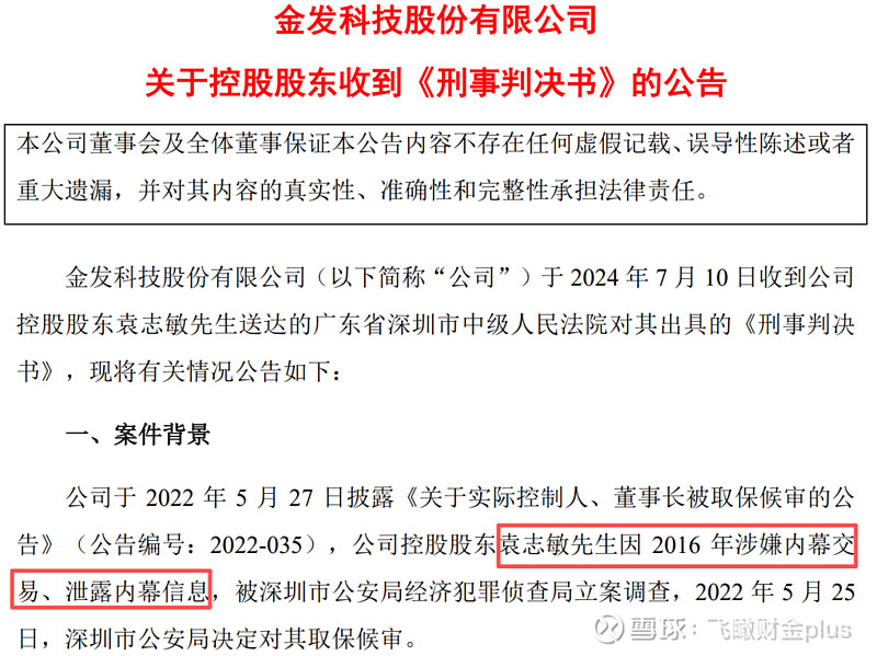 值得一提的是,袁志敏也曾因犯内幕交易罪被判刑。2024年7月11日晚金发科技公告,于2024年7月10日收到公司控股股东袁志敏送达的广东省深圳市中级人民法院对其出具的《刑事判决书》。判决书显示,袁志敏犯内幕交易罪,判处有期徒刑三年,缓刑四年,并处罚金90万元。