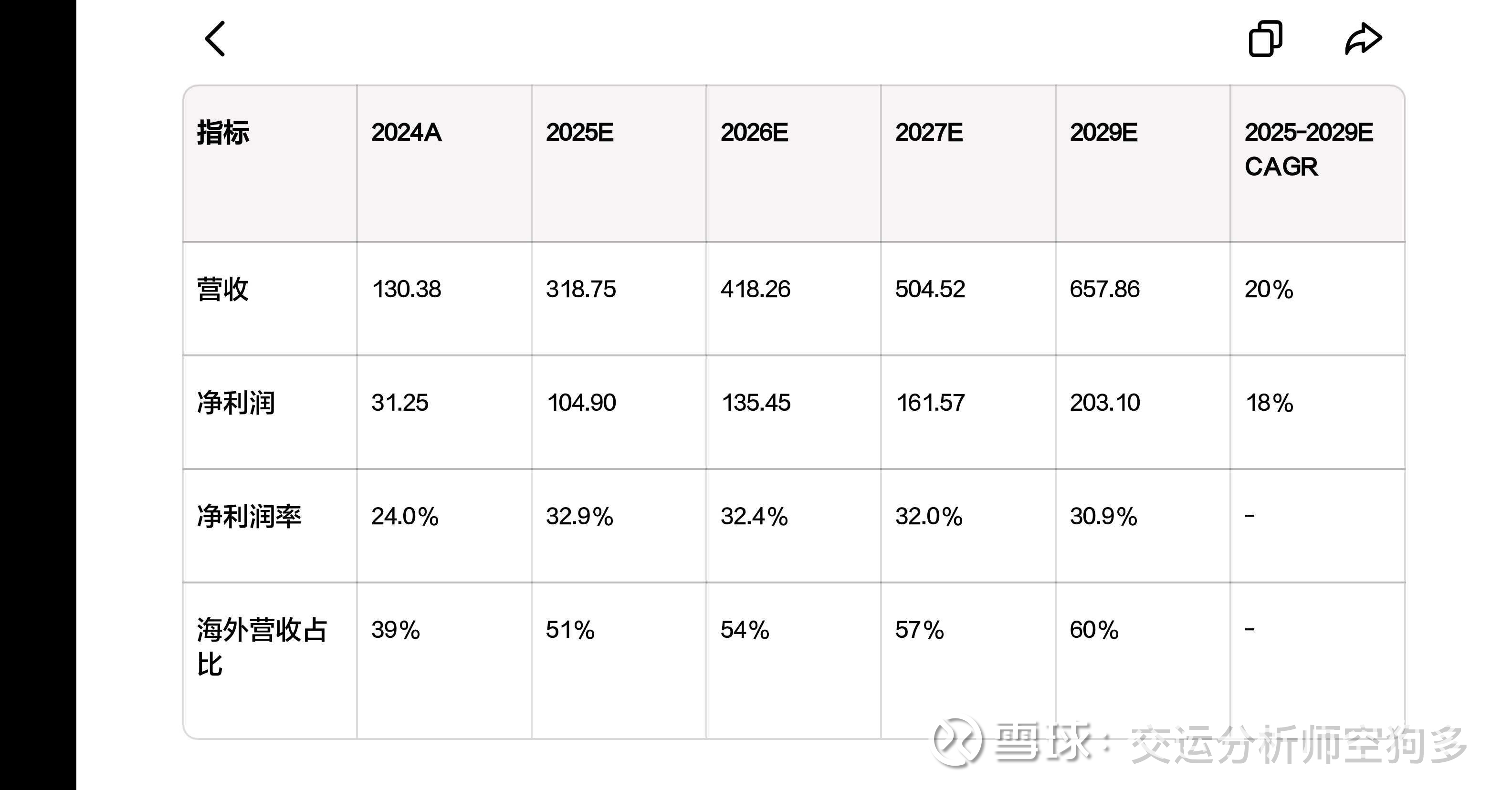 - 海外扩张:海外营收占比从2025年51%升至2029年60%,CAGR 25%(中国市场CAGR 13%)
