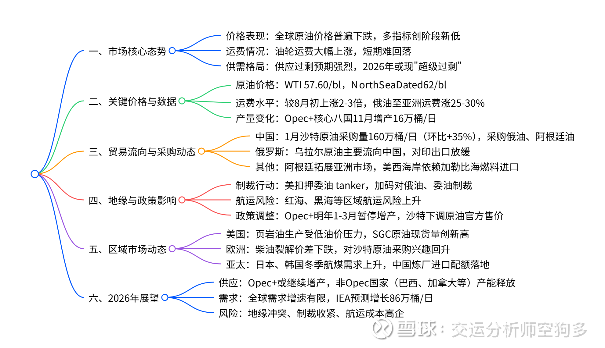 2025 年 12 月的全球原油市场呈现价格普遍下跌、油轮运费高企且短期难缓解的态势,WTI 跌至$57.60/bl、North Sea Dated跌至$62/bl,主要受海上原油积压、Opec + 增产带来的供应过剩预期影响;同时,地缘政治冲突(美委VLCC 扣押、俄乌相关航运袭击)、制裁收紧(俄油、委油相关)重塑贸易流向,中国对沙特原油采购量提升,俄罗斯乌拉尔原油依赖中国需求维持价差,而低油价正对美国页岩油生产构成压力,2026 年市场大概率仍将持续面临供应过剩与高运费并存的局面。