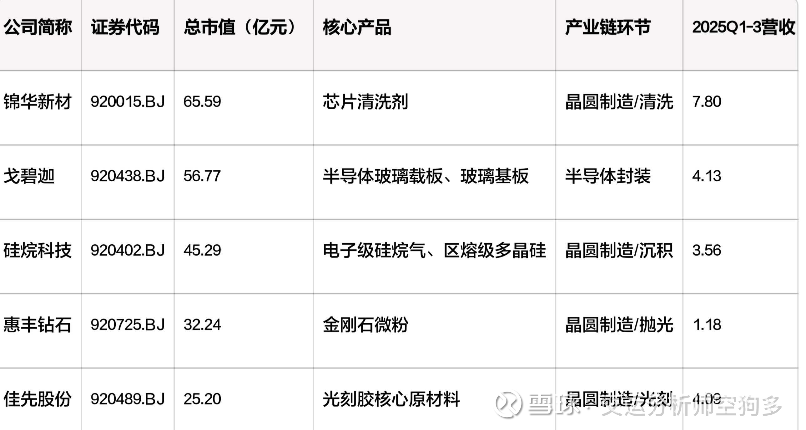 | 硅烷科技 | 920402.BJ | 45.29 | 电子级硅烷气、区熔级多晶硅 | 晶圆制造/沉积 | 3.56 | -5369.87 |