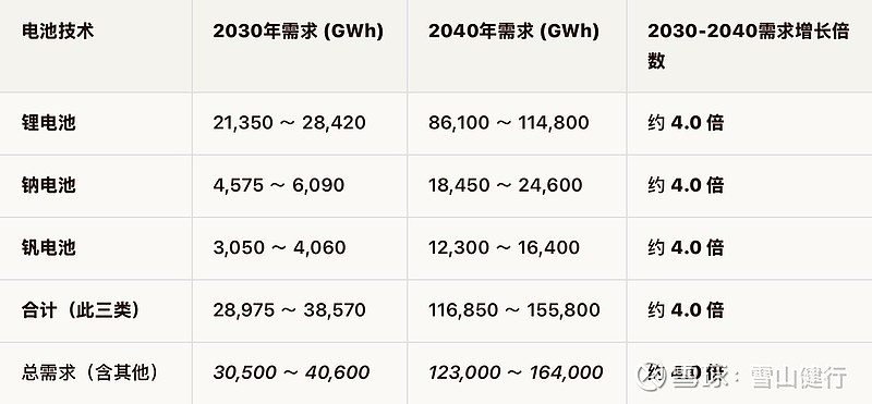 视角从中国看到全球的市场。2025年国际能源署给出的全球用电量是预估均值31500万亿瓦时,每年增长率3%,那么对应2030,2040全球的电力需求是37100,49900万亿瓦时,新能源发电量按照2030年20%,2040年60%假设,2030年全年新能源电力7420万亿瓦时,平均每天是20.3万亿瓦时,2040年全年新能源29940万亿瓦时,平均每天耗电量是82万亿瓦时。至于多少是合理的储能中心配置,本人电力小白也给不出答案。假设按照1.5-2倍的配比配置储能中心,那么2030年的储能中心需求是30.5-40.6万亿瓦时,2040年是123-164万亿瓦时,也就是2030年的总储能中心需求是30500-40600gwh,2040年是123000-164000gwh。