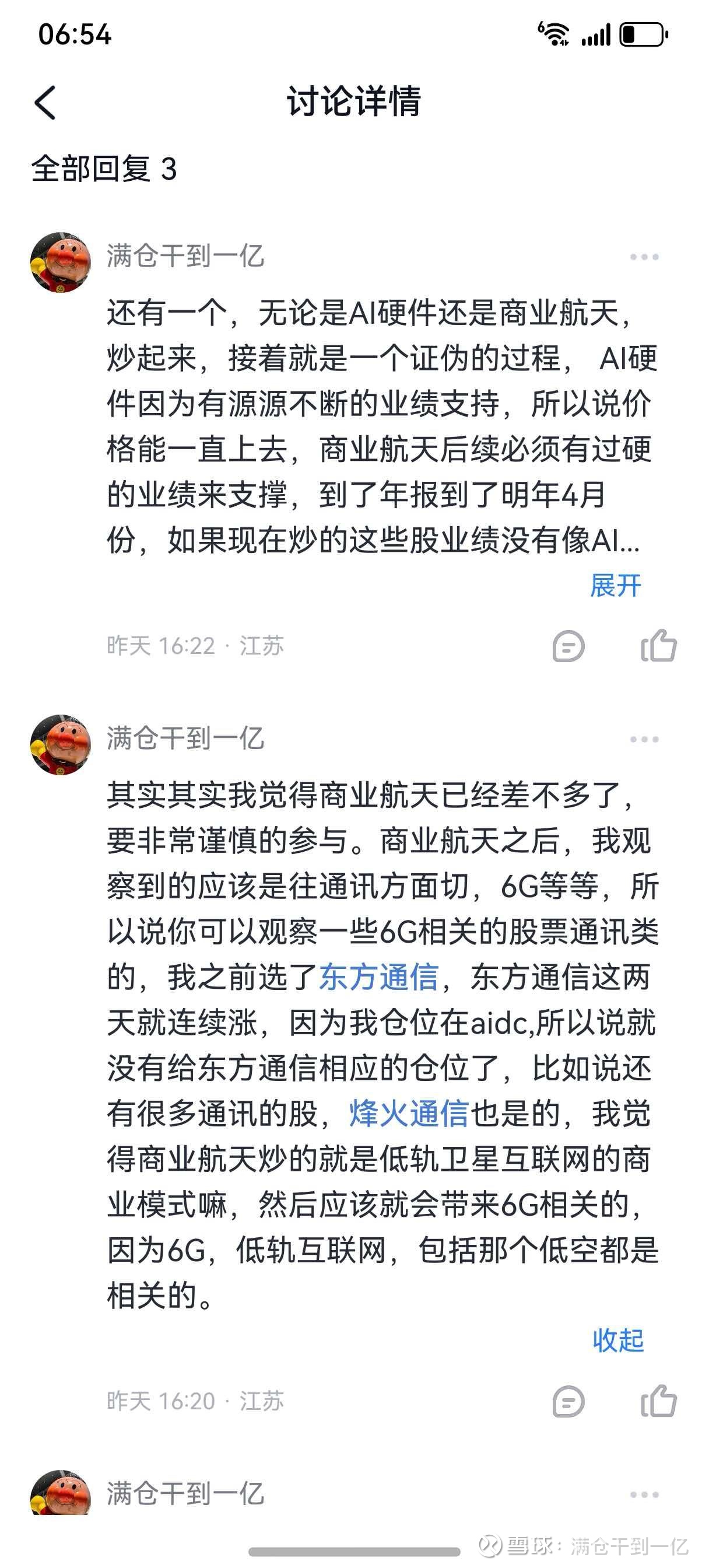 其实今天有点遗憾,这两天跟股友交流的时候推测商业航天应该会往6G通讯方面发酵,今天早上三维通讯从跌两个点拉上来一个点的时候犹豫了一下,回到0.27%+的位置没有进,结果一飞冲天。