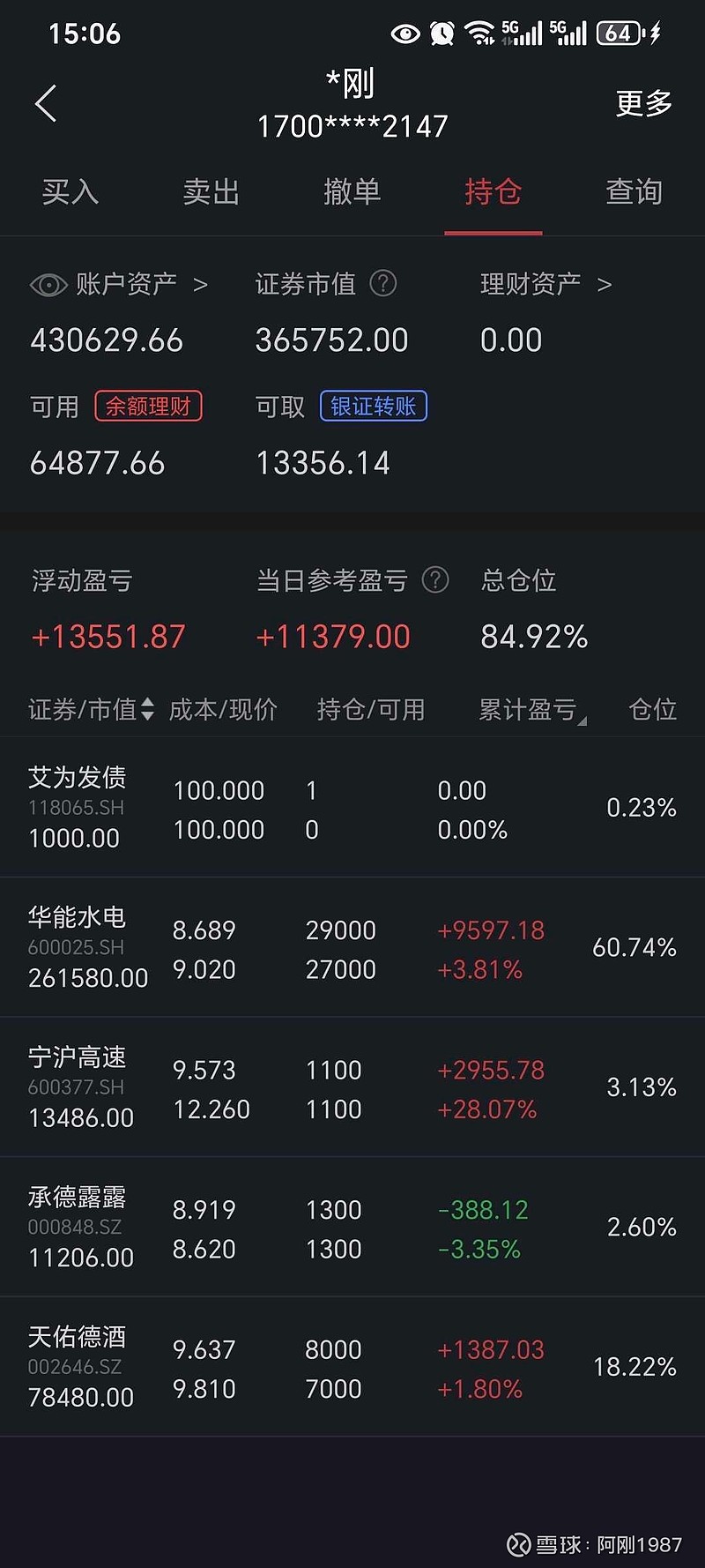 老登熬出来了,不容易啊今天减仓天佑德,固定仓位不动,跌了在加,剩余仓位涨到目标值再看情况。华能真狗啊,这两天这么多人都不看好了吗,跌了我借钱也要加仓。$华能水电(SH600025)$ $天佑德酒(SZ002646)$
