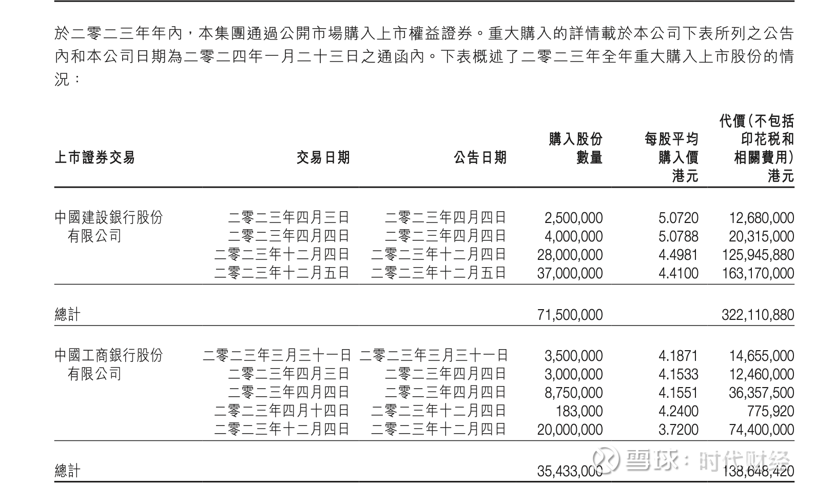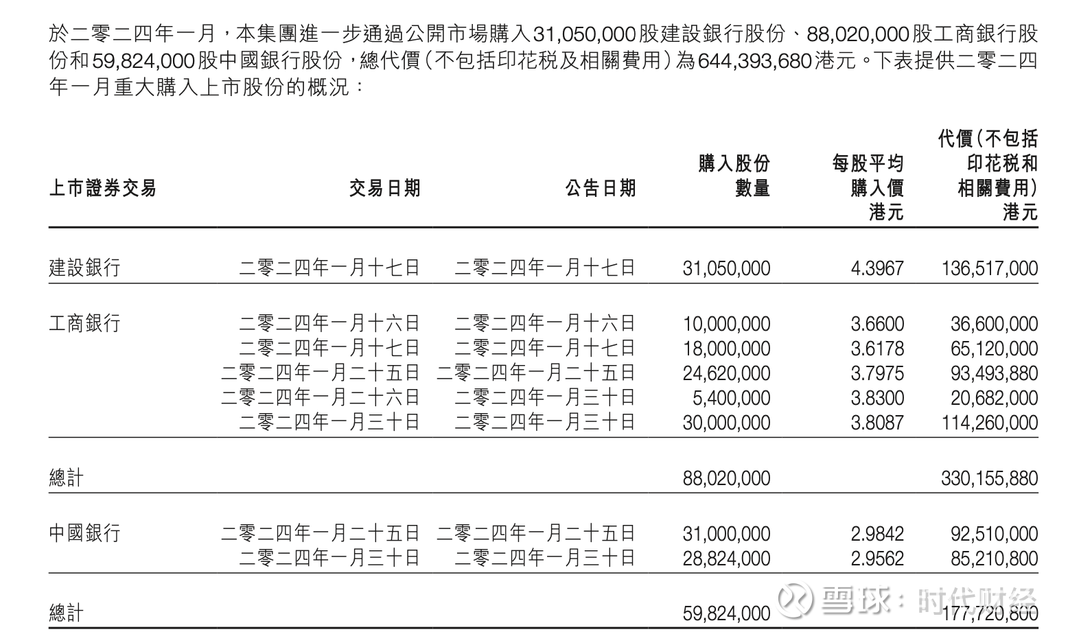12月6日,旭日企业(00393.HK)发布公告称,集团于12月5日分别出售3400万股、3300万股工商银行、建设银行股份,平均出售价分别为4.69港元/股、6.07港元/股,总代价分别为1.59亿港元、2.003亿港元。