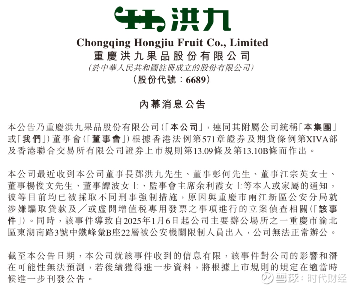 同时,洪九果品还在公告中表示,该事件导致自2025年1月6日起公司主要办公场所之一重庆市渝北区东湖南路3号中铁峰汇B座22层被公安机关限制人员出入,公司无法正常办公。