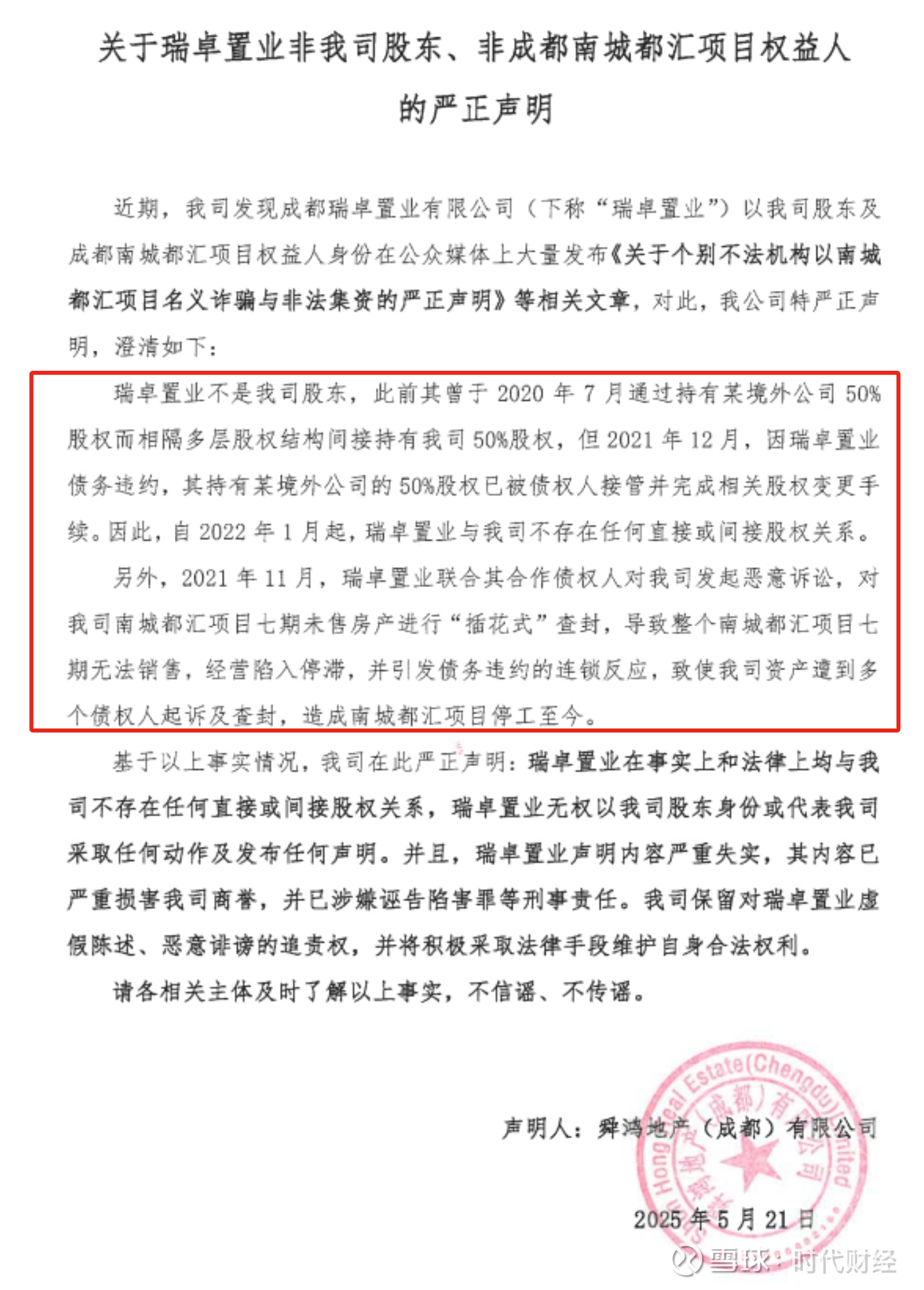 舜鸿成都公司指出,瑞卓置业曾经间接持有公司50%股权,但2021年12月,因瑞卓置业债务违约,其持有的相关股权已被债权人接管并完成相关股权变更手续,自2022年1月起,瑞卓置业已与公司“不存在任何直接或间接股权关系”。