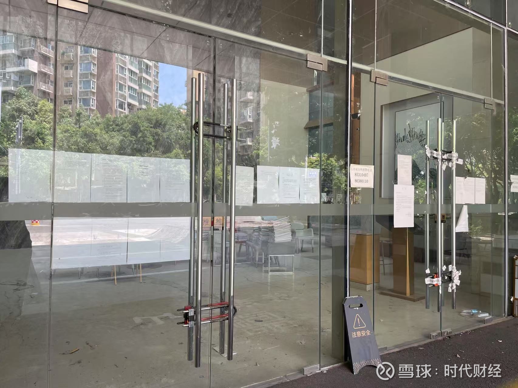 山河玖璋的销售中心大门紧闭,内部空无一人,但堆放着许多资料。玻璃门贴着自2023年以来的电费缴费、水费欠费催缴通知单,以及长实集团委托的接管人蔡伟康作出的多项决议的公示,包括法定代表人变更、董事会成员变更,以及公司管理团队成员变更等。