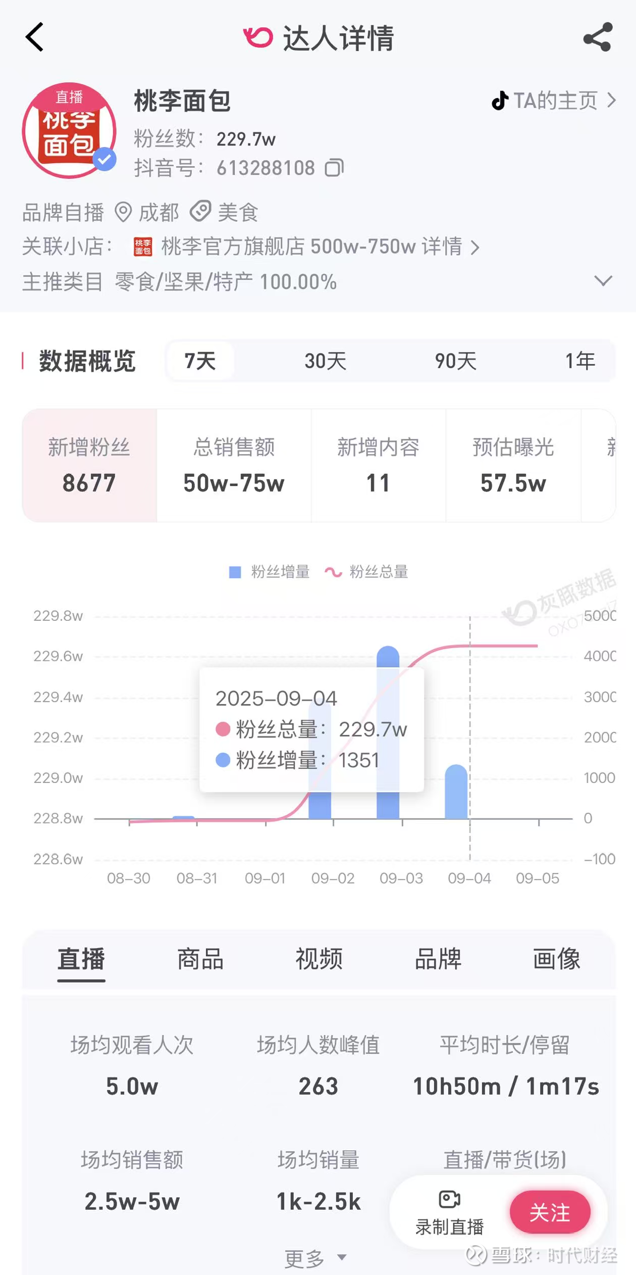不过,从抖音账号粉丝数与直播间销售额看,说教式文案未对桃李面包销售带来冲击。灰豚数据显示,9月2日至4日,桃李面包抖音账号粉丝整体呈上升趋势,近7天内新增粉丝8677人。9月3日、4日,桃李面包直播间销售额均为10万元至25万元,系品牌近30天来销售额的峰值。