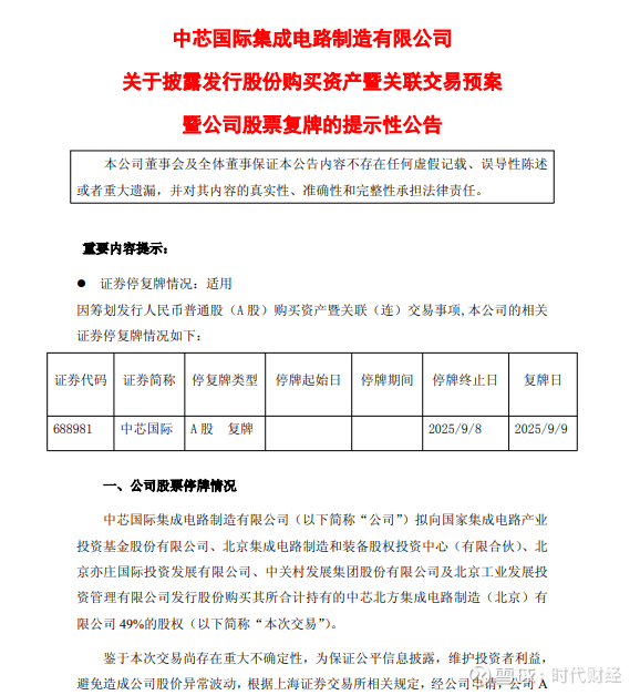早在8月29日晚,中芯国际发布停牌公告,称公司正在筹划购买公司控股子公司中芯北方的49%少数股权,并自2025年9月1日(星期一)开市起停牌。9月8日晚,中芯国际披露收购中芯北方少数股权的预案,9月9日中芯国际A股迎来复牌。