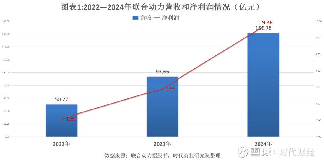 招股书显示,报告期各期,联合动力的营收分别为50.27亿元、93.65亿元、161.78亿元,2022—2024年营收年复合增长率达79.39%,净利润分别为-1.80亿元、1.86亿元、9.36亿元,2023年扭亏后高速增长。