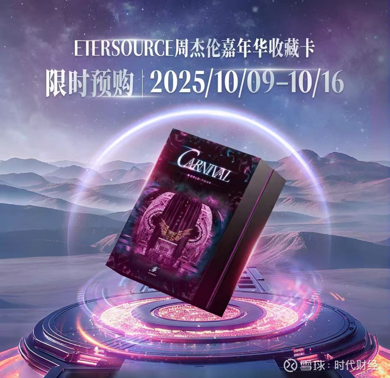 距离周杰伦宣布以“周同学”账号入驻抖音平台刚好3个月,10月9日,Etersource品牌宣布推出官方授权周杰伦“嘉年华”世界巡回演唱会系列收藏纪念卡。“周杰伦概念股”巨星传奇(06683.HK)作为该品牌发售全球总代理,这也是周杰伦出道25周年的首款官方授权收藏卡。