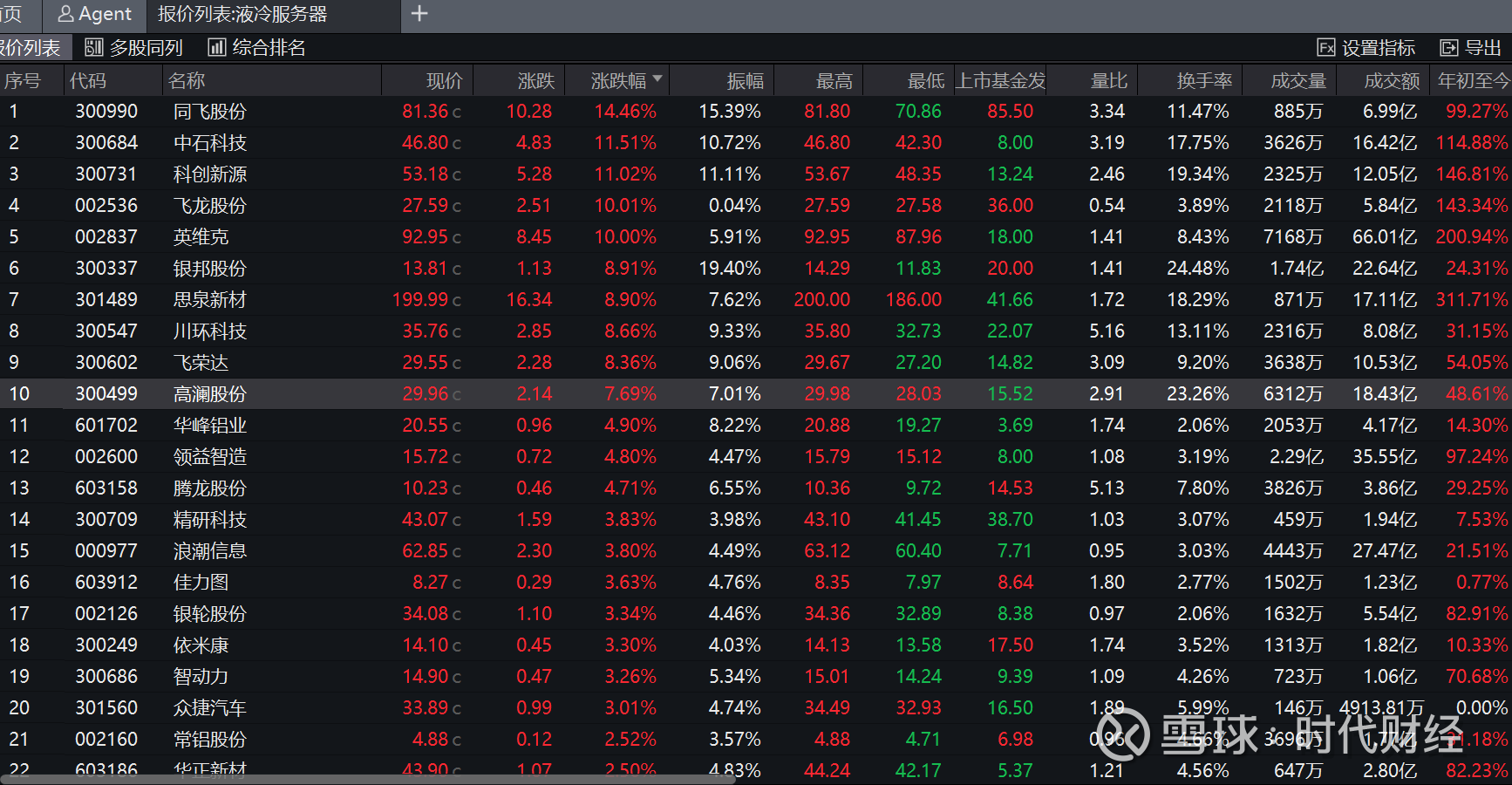 从液冷服务器领涨个股来看,英维克是技术领先的精密温控节能解决方案与产品提供商;飞龙股份业务涉及液冷领域热管理部件产品;同飞股份致力于工业制冷设备的研发;中石科技为智能电子设备提供散热一体化的整体解决方案;科创新源业务涉及热管理系统产品;银邦股份、思泉新材、飞荣达主营铝热传输或热管理材料;川环科技专注汽车胶管领域。