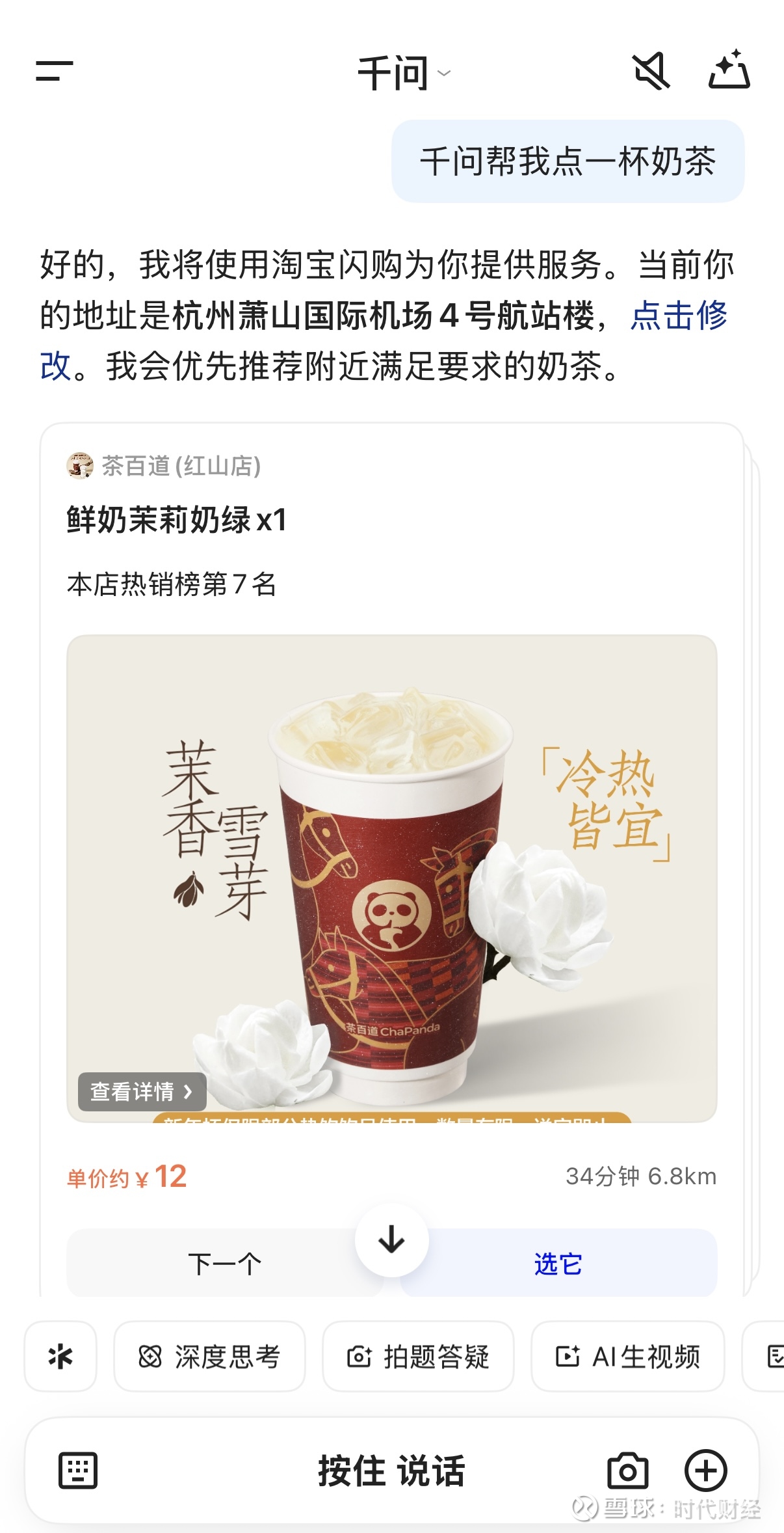时代财经实测体验千问App点外卖功能