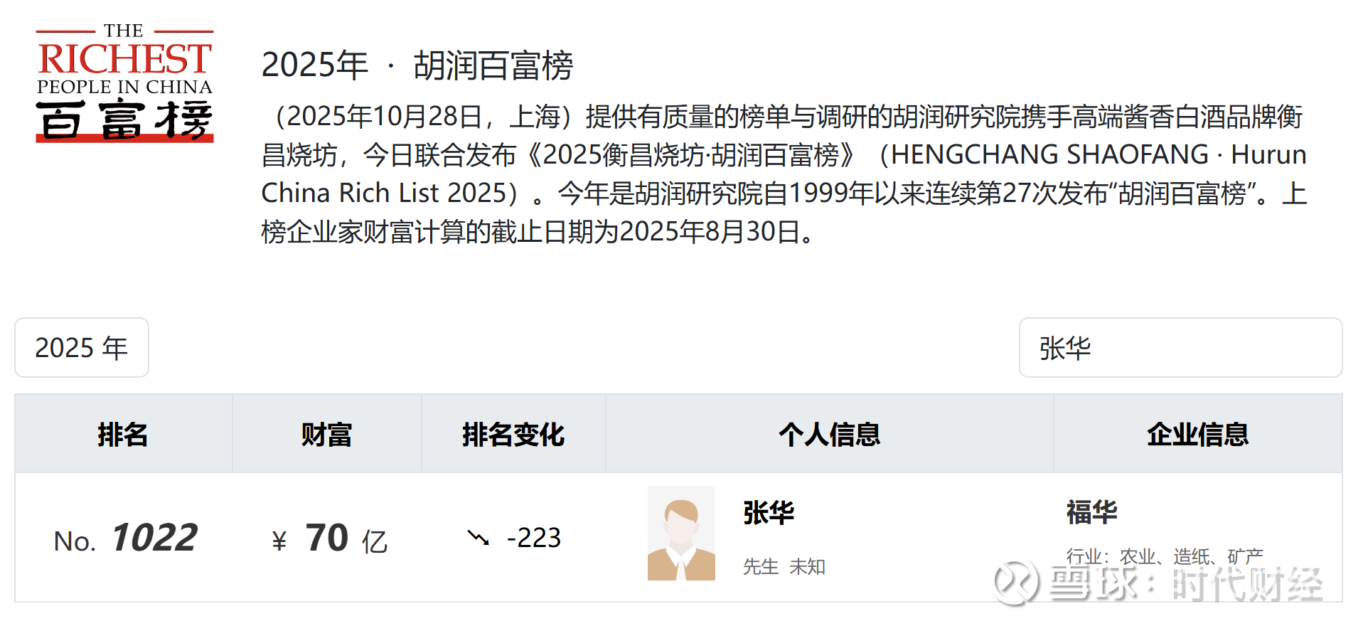 据时代财经了解,张华是四川乐山知名企业家,自福华化学2007年12月成立至今,一直担任该公司的董事长。2025年,张华以70亿元人民币财富位列《2025年胡润百富榜》第1022位,较2024年下降223位。