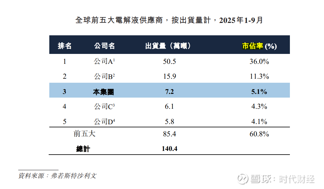 时代财经注意到,2025年前三季度,全球电解液累计出货量达到约140.4万吨。按出货量计算,前五大电解液供应商的合计市占率为60.8%,市场份额相对集中。但即便是前五大电解液供应商,市占率方面也是差距巨大。