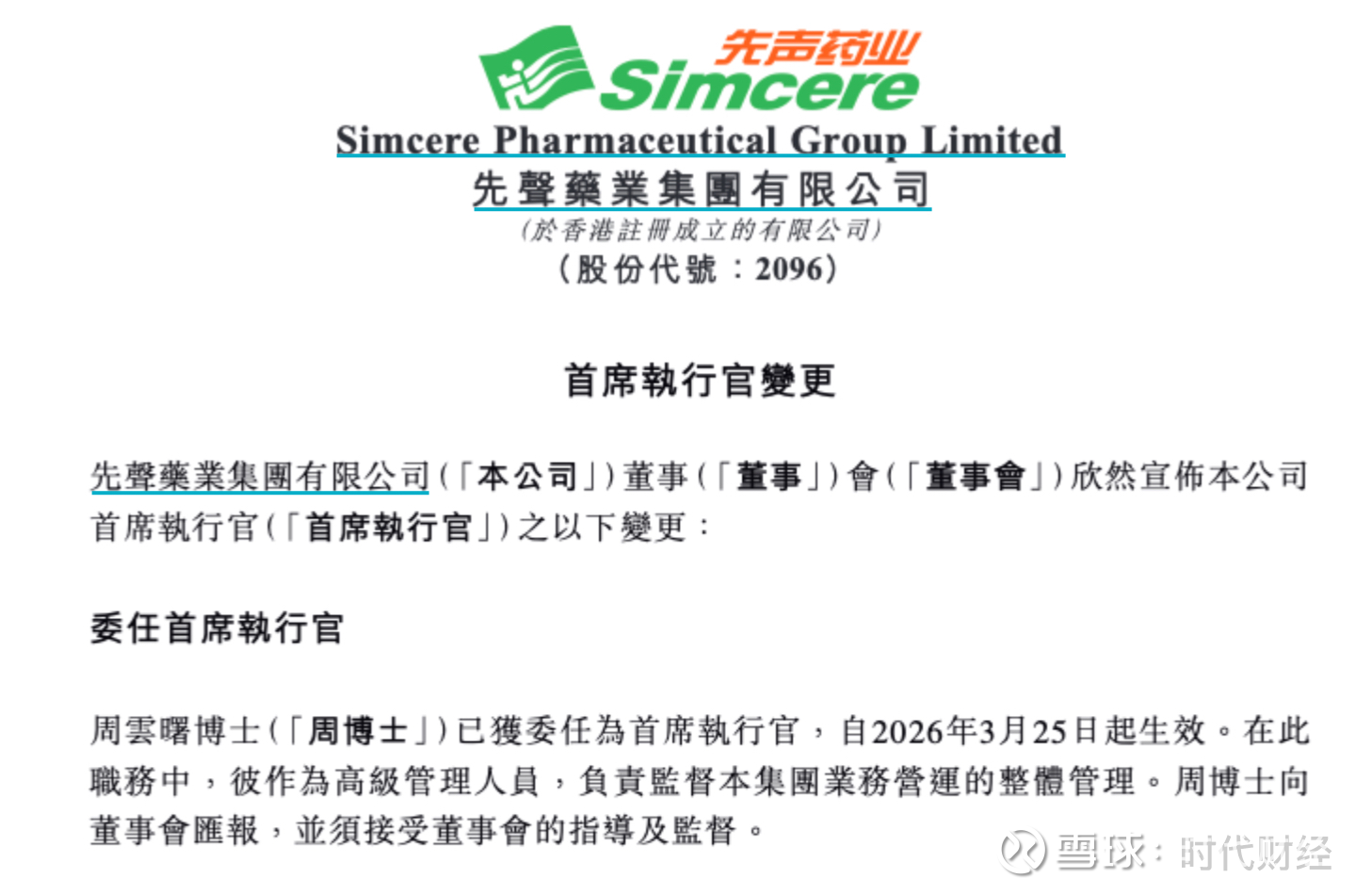 先声药业在公告中表示,董事会相信,其委任将大幅加强本公司在多个领域的业务发展,特别是在创新药研发及商业化方面,并认定委任周云曙为首席执行官符合本公司及其全体股东的整体利益。