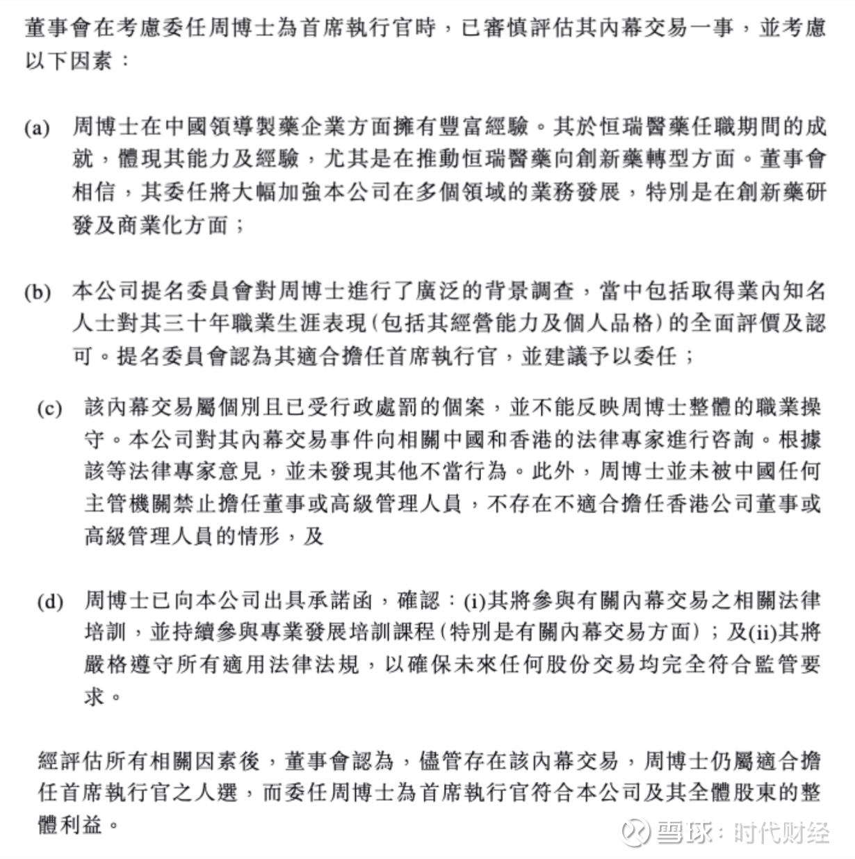 对于周云曙因内幕交易被罚一事,先声药业在公告中回应称,该内幕交易属个别且已受行政处罚的个案,并不能反映其整体职业操守,并披露了相关背景调查、法律专家咨询以及周云曙本人出具的法律培训承诺函。