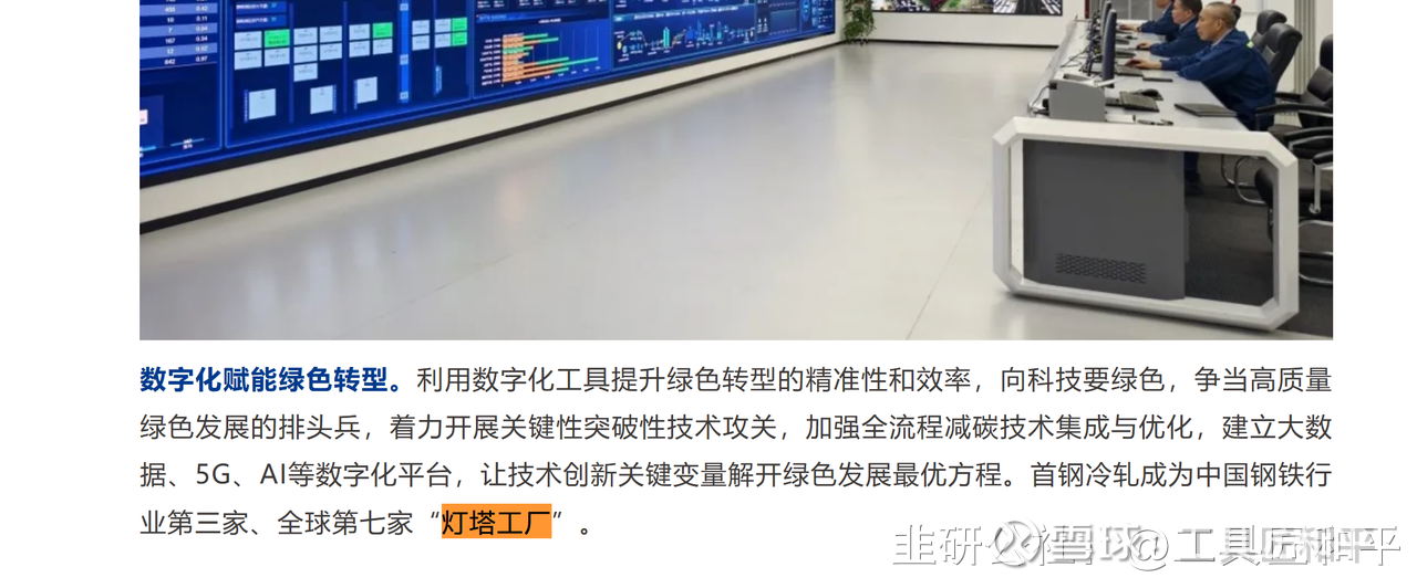 数字化赋能绿色转型。利用数字化工具提升绿色转型的精准性和效率,向科技要绿色,争当高质量绿色发展的排头兵,着力开展关键性突破性技术攻关,加强全流程减碳技术集成与优化,建立大数据、5G、AI等数字化平台,让技术创新关键变量解开绿色发展最优方程。首钢冷轧成为中国钢铁行业第三家、全球第七家“灯塔工厂”。