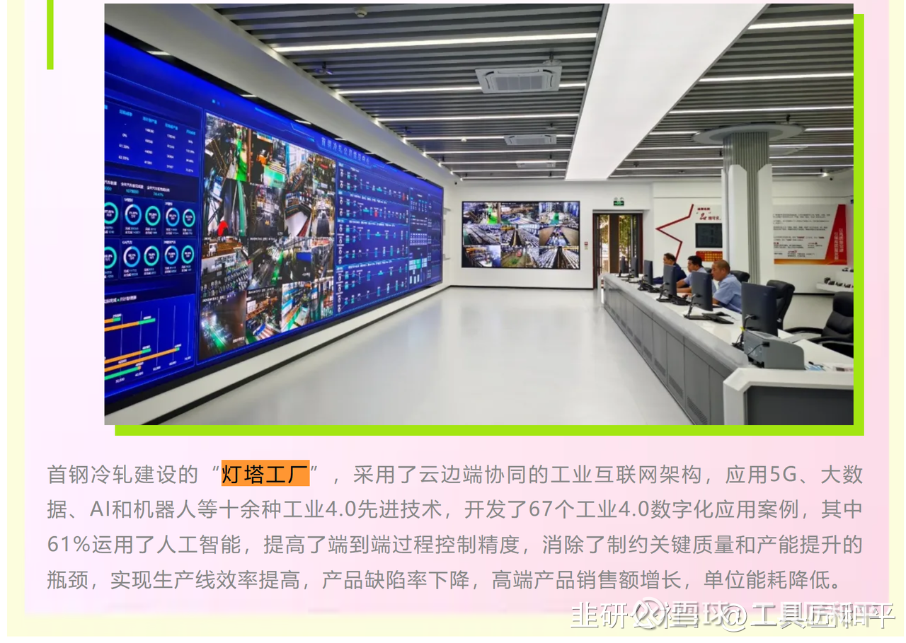 首钢冷轧建设的“灯塔工厂”,采用了云边端协同的工业互联网架构,应用5G、大数据、AI和机器人等十余种工业4.0先进技术,开发了67个工业4.0数字化应用案例,其中61%运用了人工智能,提高了端到端过程控制精度,消除了制约关键质量和产能提升的瓶颈,实现生产线效率提高,产品缺陷率下降,高端产品销售额增长,单位能耗降低。