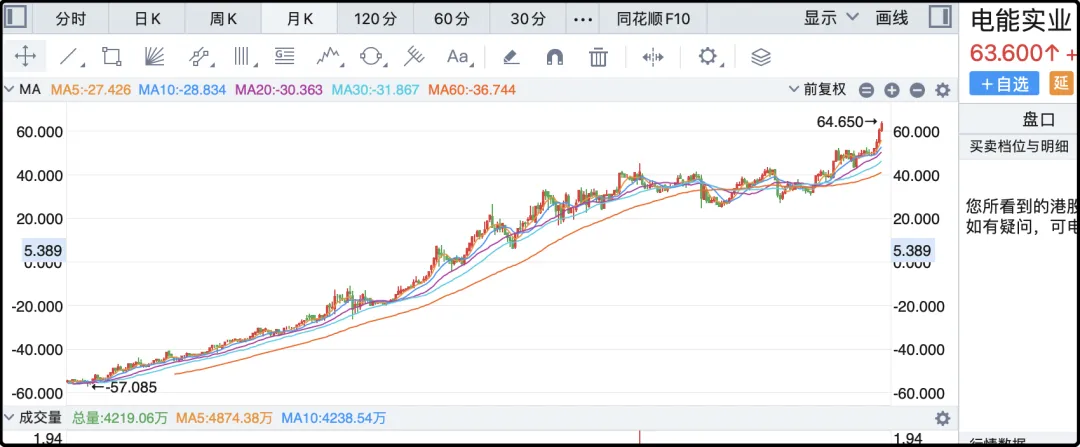 因为之前舆情风波,很多网民都看李嘉诚不顺眼,但作为股民你一定不会嫌弃李嘉诚的公司,因为每一支股都不差。我持仓多年的是电能实业,过去25年的月k线是这样的: