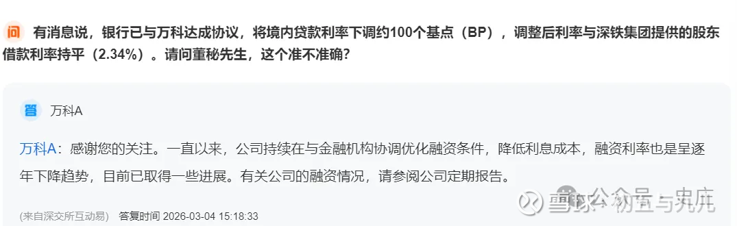 投资者提问:据说有银行已经与万科达成协议,将贷款利率下调约100个基点,和深铁给万科的股东借款利率2.34%持平。