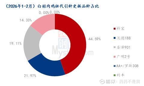据Mysteel农产品白羽肉鸡祖代更新品种情况来看,2026年1-2月份,科宝祖代更新占比为44.59%;沃德188品种占比为21.97%;圣泽901(901Plus)品种占比19.11%;广明2号品种占比14.33%;AA+、罗斯308、利丰品种占比0.00%。