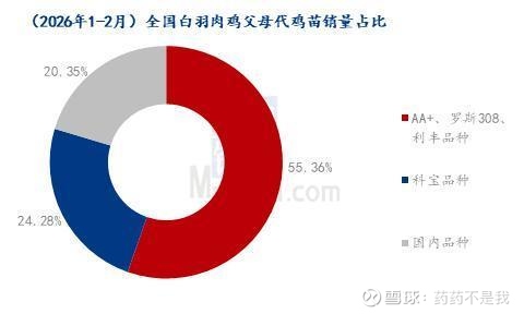 从父母代鸡苗销售品种占比情况来看,2026年1-2月,AA+、罗斯308、利丰品种销量占比55.36%;科宝品种销量占比24.28%;国内品种(圣泽901/901Plus、广明2号、沃德188)销量占比20.35%。