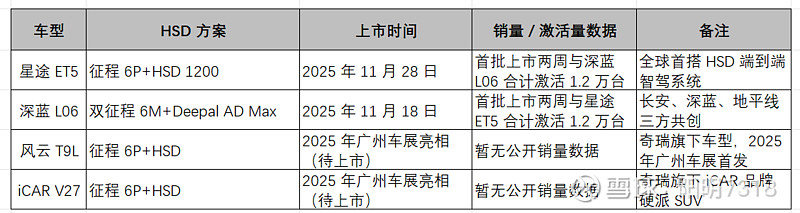 地平线HSD(HorizonSuperDrive)目前已搭载于星途ET5、深蓝L06、风云T9L、iCARV27等车型,以下为已公开的车型及销量数据:
