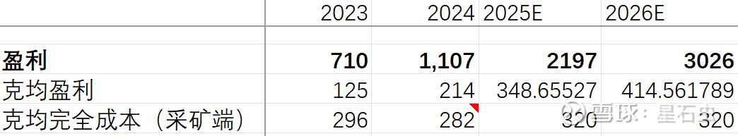3. 成本:按照采矿分部的盈利核算,2023-2024年的克均成本(预计是对应利润表中的EBIT,而非通用的AISC成本)大概在280-290元/g左右;尽管公司指引成本不上升,但随着金价的上升,优先开采低品位矿应该会成为金矿的统一选择,为了安全边际,假设2026年EBIT对应的成本上升到320元/g