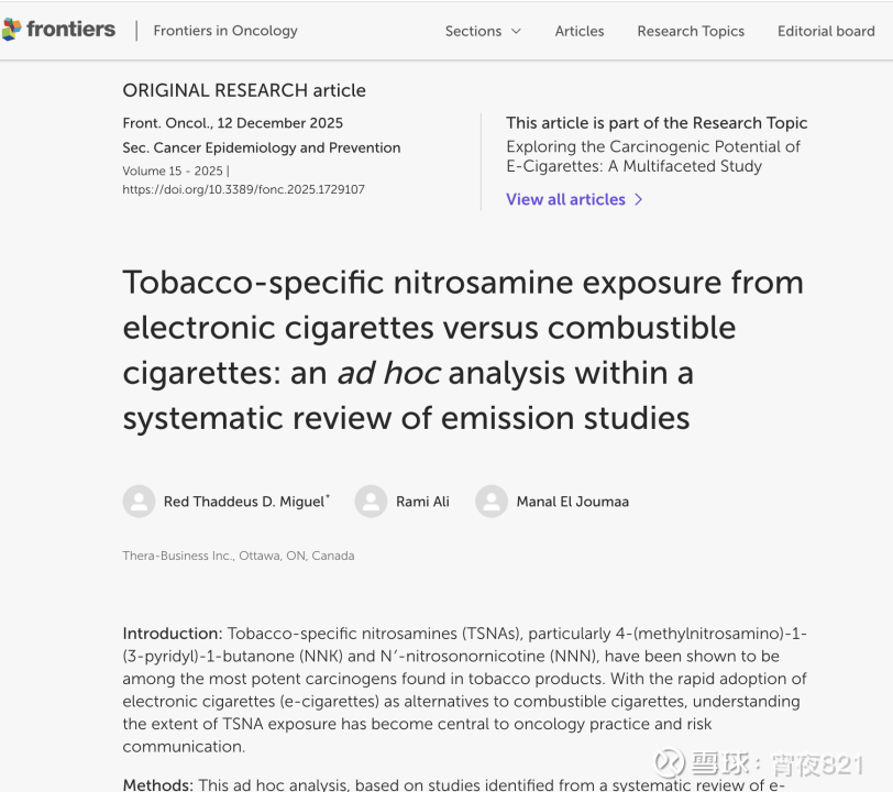 $雾芯科技(RLX)$ $思摩尔国际(06969)$12月22日,《肿瘤学前沿》(Frontiers in Oncology)在线发布的一份重磅综述表示,与传统卷烟相比,电子烟释放的致癌物NNK与NNN平均降幅超过99%,浓度低至空气平均水平。这表明烟民完全改用合规电子烟,可以显著减少烟草特有亚硝胺(TSNAs)的摄入,进而减少肺癌、食管鳞癌等疾病风险,对肿瘤预防具有积极意义。