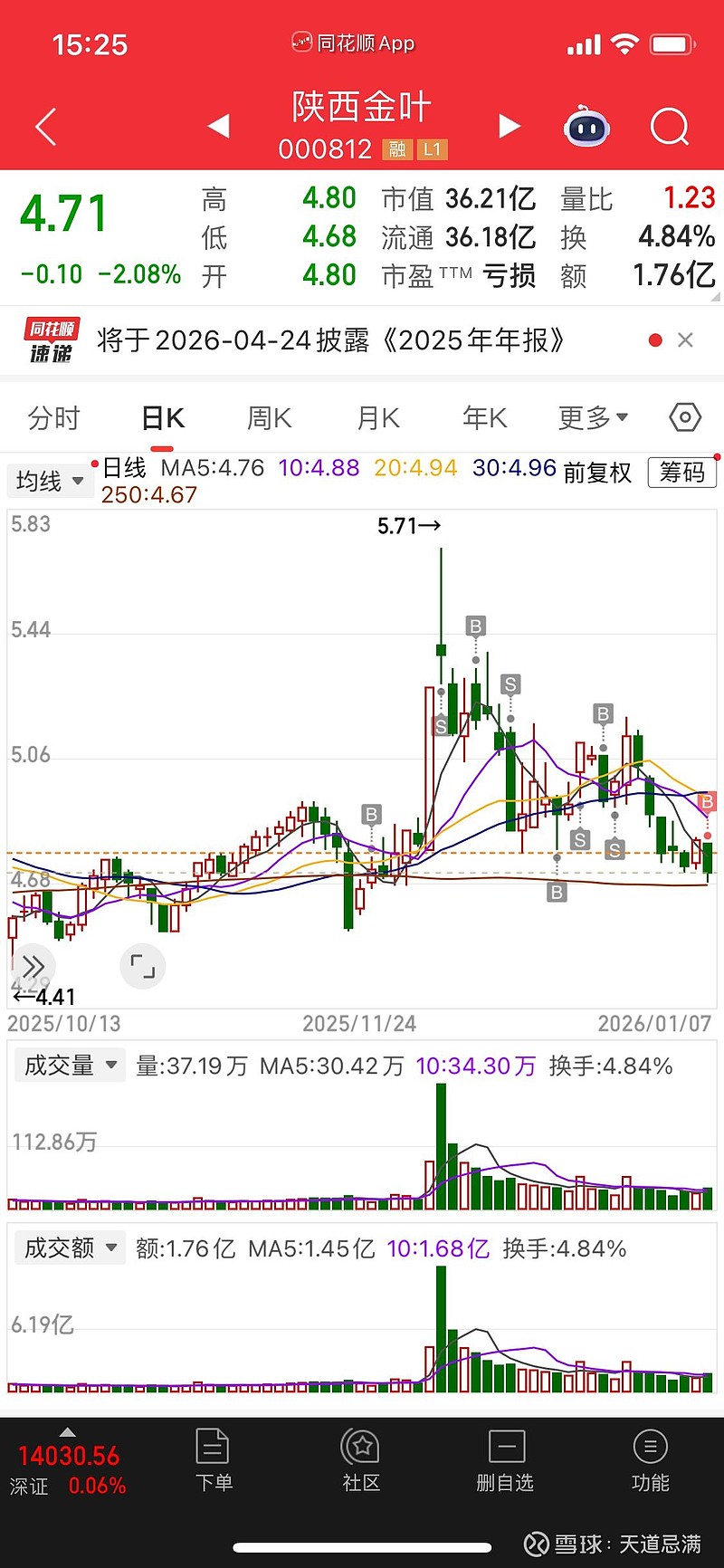 我等了半天大盘不往下走,刚进去2分钟大盘拐头向下,天天上一当,当当不一样。陕西金叶调整好些天了,应该问题不大,就是这个位置从今天看买在了山顶,很郁闷。