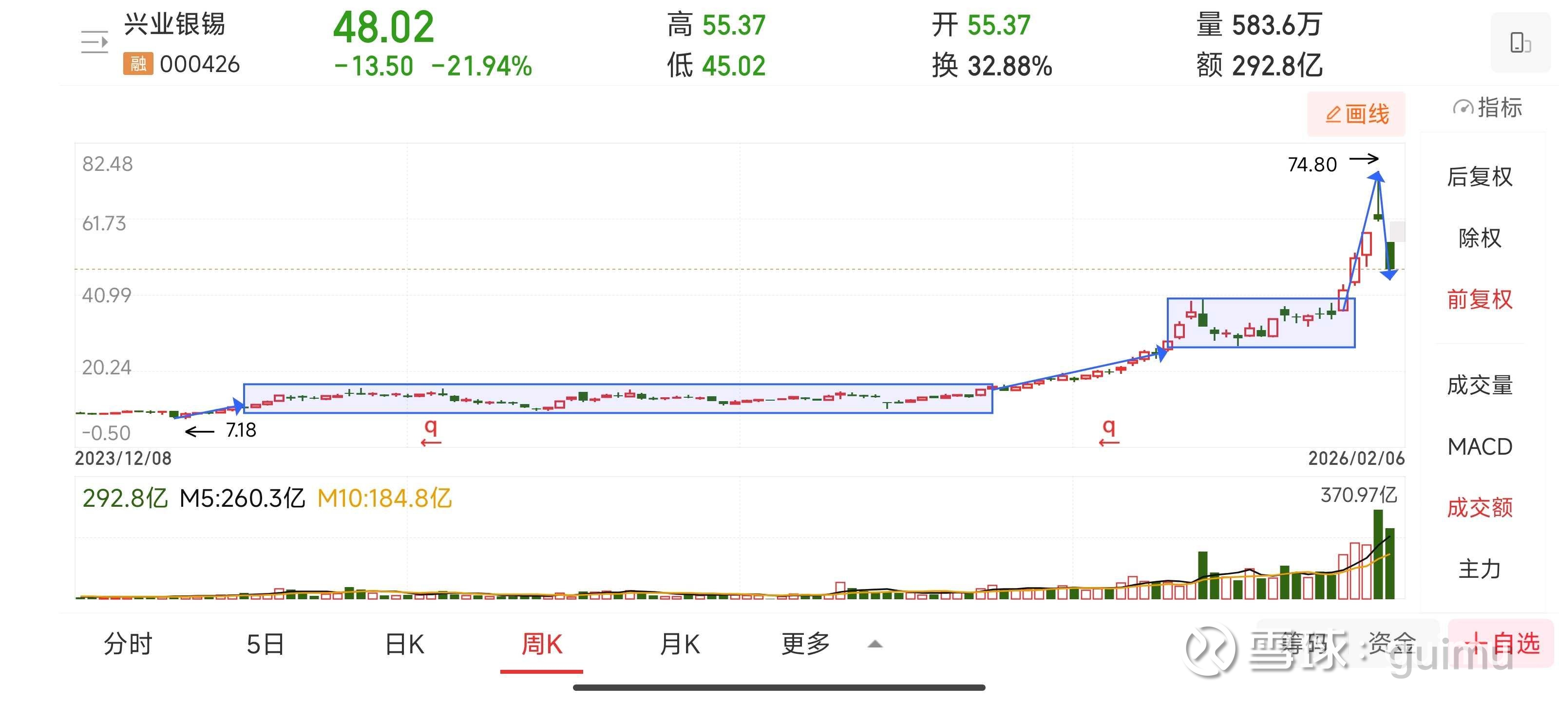 再来看24,25年的10倍大牛股兴业银锡的周线图