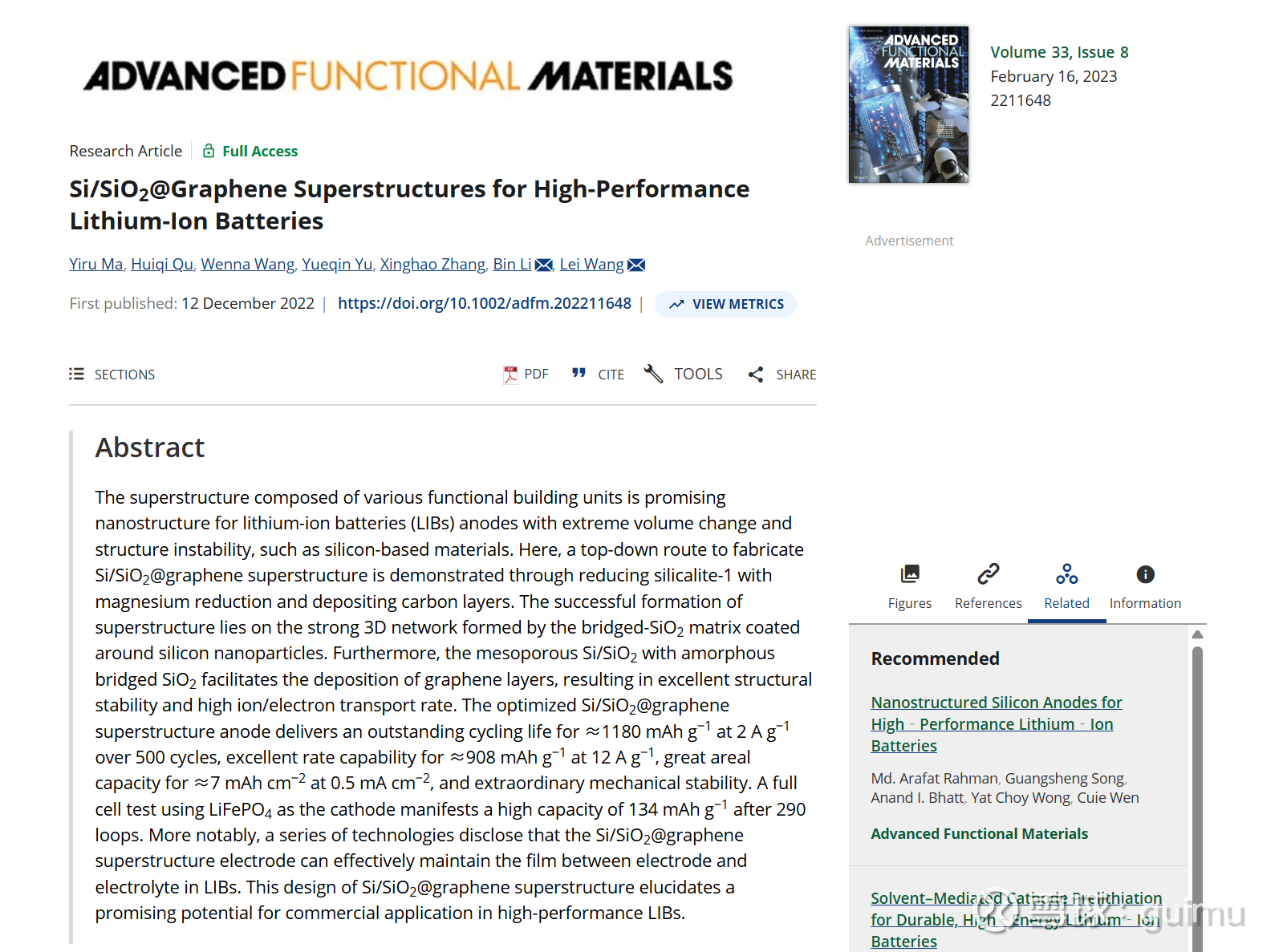 我们检索王磊教授发表过的有关于硅碳负极的文章,发现了一篇于2023年发表在《Advanced Functional Materials》中的文章(博主是学材料的,这个期刊属于材料领域中的顶级刊物之一了,可见王磊教授的学术水平相当高)。