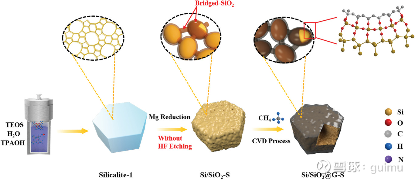 基于硅基负极材料在锂离子电池(LIBs)中面临体积膨胀和结构不稳定的挑战,本研究展示了一种自上而下的策略制备Si/SiO₂@石墨烯超结构。该方法通过镁还原silicalite-1分子筛并结合碳层沉积实现。超结构的成功构建依赖于硅纳米颗粒周围包裹的桥接SiO₂基质形成的强韧三维网络。此外,具有无定形桥接SiO₂的介孔Si/SiO₂结构促进了石墨烯层的沉积,从而赋予材料优异的结构稳定性和高离子/电子传输速率。