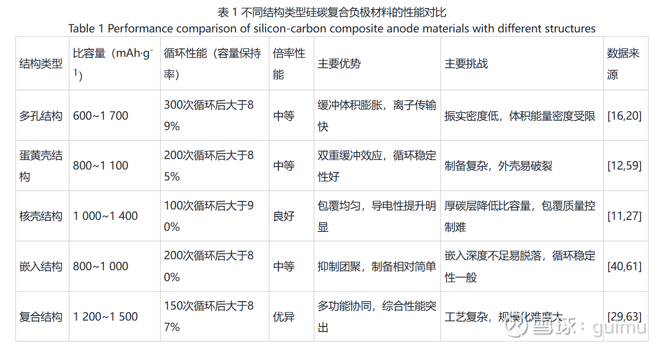 众所周知,限制硅碳负极使用的主要因素是硅在反复合金化中的体积膨胀效应,这也是产业界想要迫切解决的问题。目前业界主要是通过设计电极的微结构以控制这个效应,具体的方法种类见下表。(陈彩霞,硅碳复合负极材料的制备技术、性能及应用进展,2025)