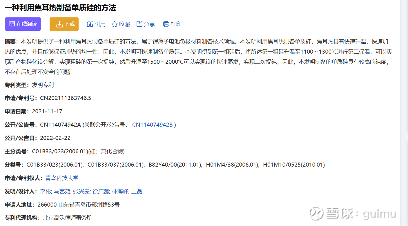 此外,之前有传闻说青岛鸿硅已经将孚日鸿硅的35%股权转让给了孚日集团。我们搜索青岛鸿硅的专利信息,可以搜到CN113593921B和CN114074942B两篇专利。而其中CN114074942B是关于单质硅的制备方法的,不出意外,还是王磊教授的专利!
