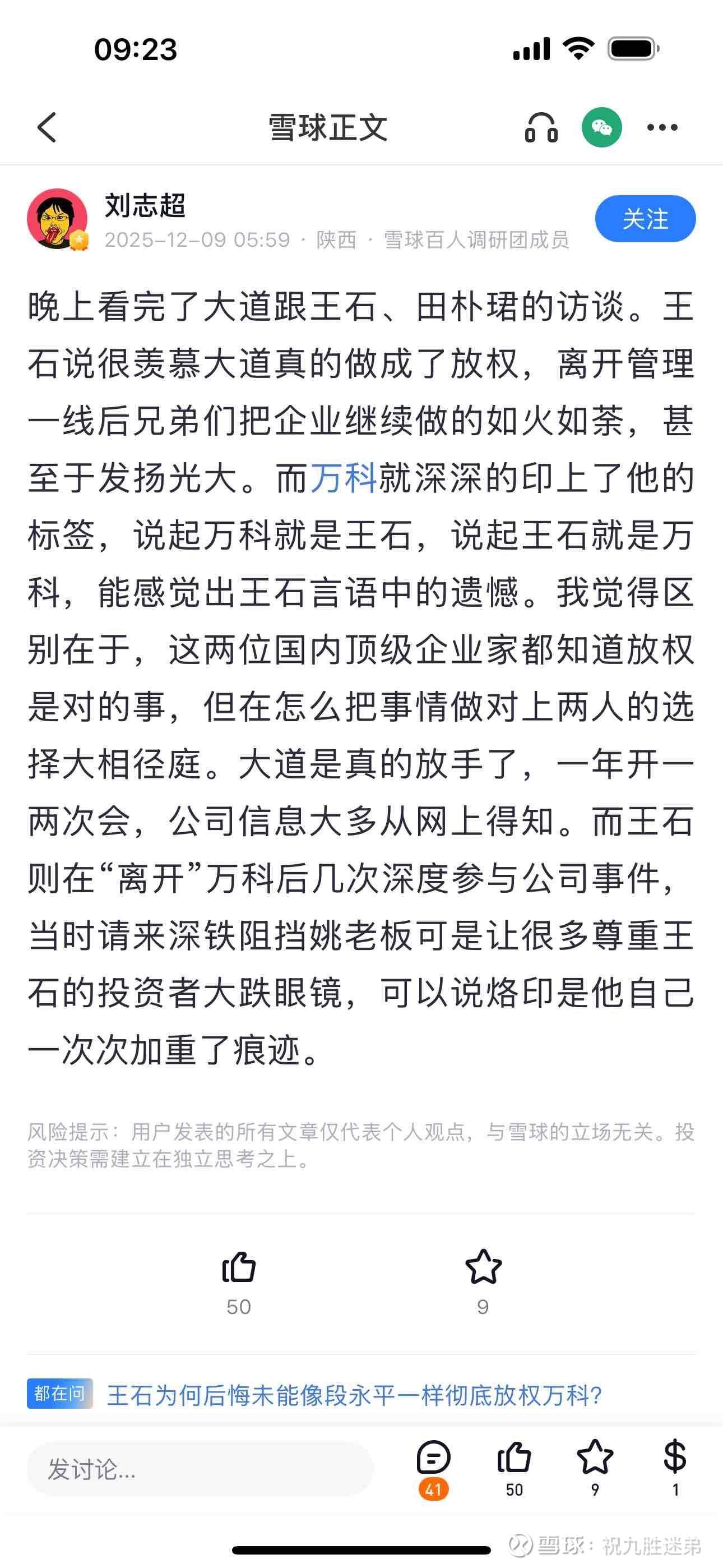 万科管理层没被曝出曼哈顿计划掏空万科之前,早年虽然一直都对王石无感,但因为万科水军整天大力给王石做营销,吹牛吹得多了,我也一度以为王石是一个成功的企业家。直到宝万之争开始才彻底看清王石这个人的嘴脸。人家宝能二级市场真金买入的万科股票,成为了万科的大股东,王石对大股东不仅毫无尊重,还直呼姚老板为野蛮人。我心想要不是你不重视市值管理,不做股票回购推高股价,姚老板能有机可乘?而且你王石对大股东都敢称野蛮人,那广大小股东自然更加不放在眼里了。后面被人曝光才知道,万科一众管理层私下有很多上不了台面的事情,如果宝能真入主万科,估计万科一众管理层早就出事了。不过事后回看结果,王石、宝能和华润都是赢家,王石虽然明面上离开了万科,但一直从万科拿着千万退休金,变相继续合法掏空万科,并成功躲开了后续的调查。宝能和华润把股票高位套现,也赚了不少钱,最后的大输家就是被王石引进高位接盘的深圳地铁。$万科A(SZ000002)$ $万科企业(02202)$