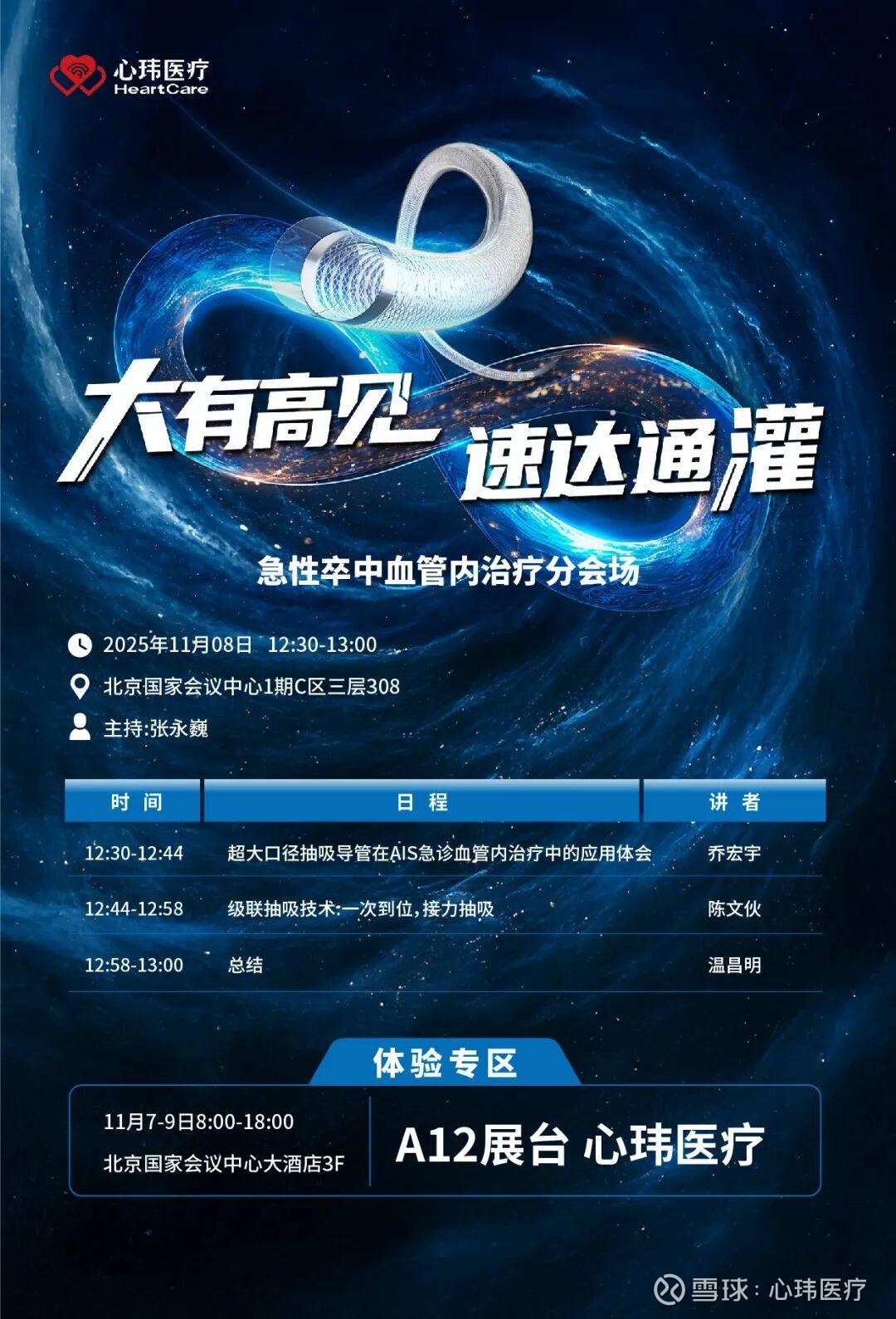 心玮医疗始终以“攻克脑卒中救治难题,守护国民脑健康”为使命,持续推动诊疗器械与技术创新,此次专题分享正是将吞川088超大口径导管与级联技术等前沿成果转化为临床价值的重要实践。我们诚挚期待与全国各级医疗机构脑卒中防治相关专业人员相聚AIS再通复流新进展分论坛,共同交流学术成果、分享实践经验,携手为“百万减残”工程落地实施及健康中国建设贡献行业力量!