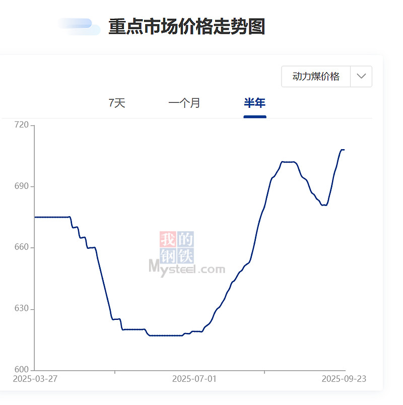 动力煤价格走势图,不知道五六月份时的620元/吨是否代表本轮煤价四年下跌周期的最低点已经出现。最新动力煤价格708元/吨。