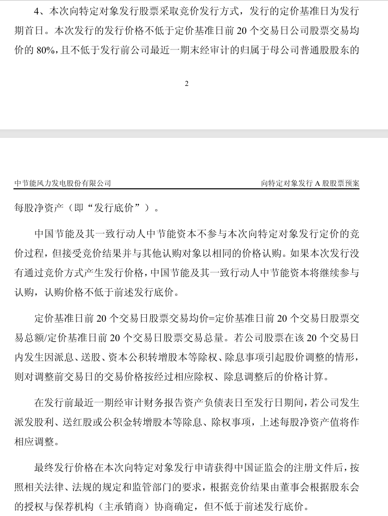 节能风电的定增定价是国企通行方式,不低于定价基准日前20个交易日的均价80%和最近一次经审计的财报每股净资产(如有分红送股等相应调整),融资金额不超过36亿。