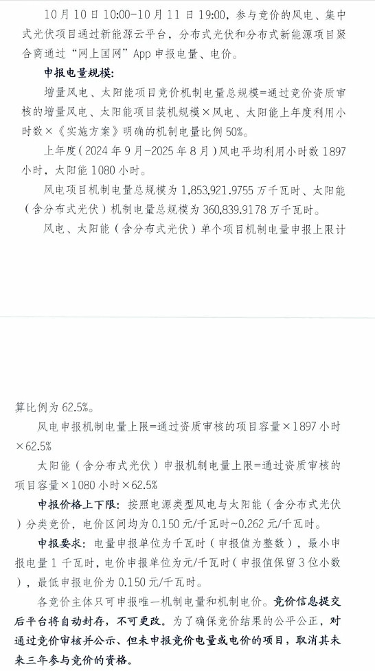 对比一下2025年6月1日后投产的新增项目机制电价竞价公告重要内容,2024年9月-2025年8月这一年,风电利用小时数1897小时,太阳能利用小时数1080小时,给2025年6月-12月投产新增项目的机制电量总量是221亿度。