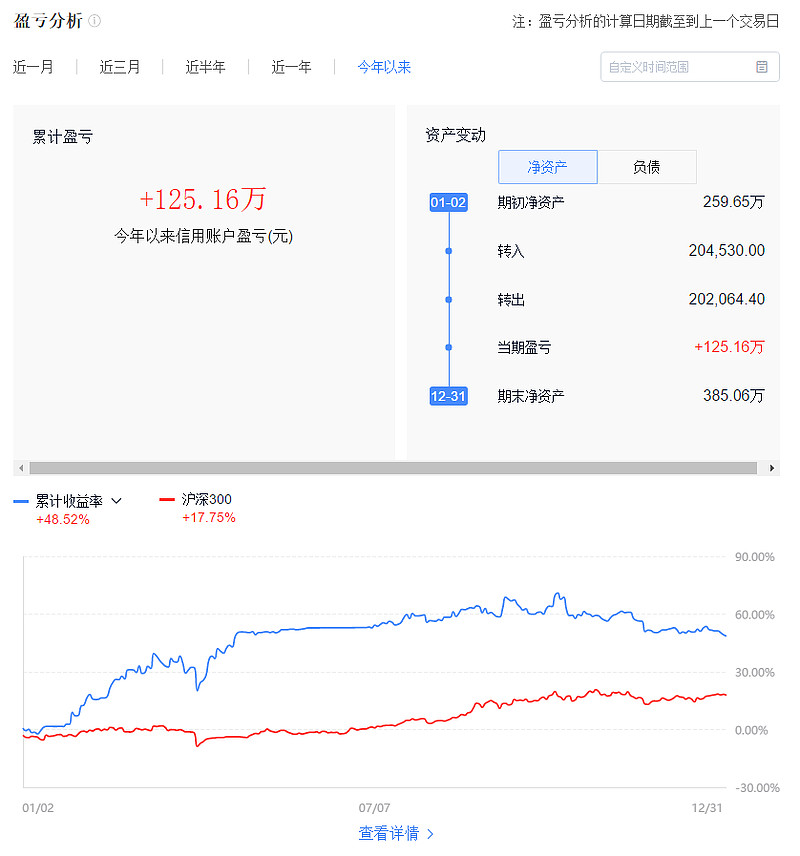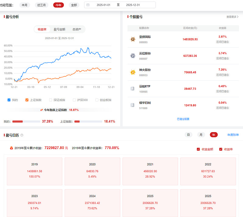 总的来说,一个年收益率37%,一个年收益率48%,平均下来年收益率41%。我收益率48%的那个账户,显示2025年战胜了88%的同券商股民,说明2025年赚到钱的股民数量很多。21-24年,我的年收益率都不高,但每年年底收益率显示的都是战胜99%的同券商股民。我这些年的买卖思路基本是定型的,没有多少变化,我今年收益率在股民排行中明显后退,我觉得还是说明市场较热的情况下注重风险回避的保守投资风格明显跑不过注重上涨空间的激进投资风格,牛市还是胆子大的赚的多。我的25年收益主要依靠亚钾国际,云铝股份和神火股份小仓位做下,主要亏损来自中绿电,不过也不多。